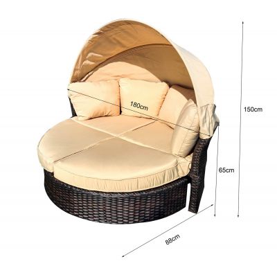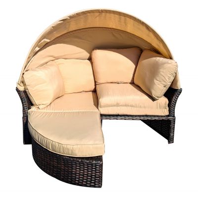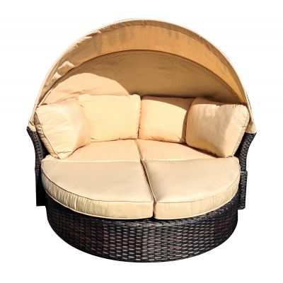 Трансформирующаяся модульная круглая кровать из искусственного ротанга — идеальное решение для зоны отдыха на открытом воздухе, в том числе у бассейна.