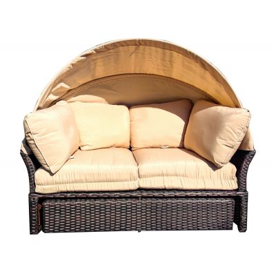 Конструкция отличается надёжностью: в основе — прочный стальной каркас, вручную оплетённый плоским искусственным ротангом. Для комфорта предусмотрена защитная функция — козырёк из 100% полиэстера, который ограничивает попадание прямых солнечных лучей.