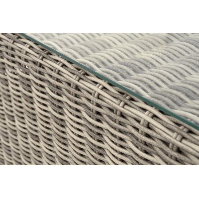 Каркас столика изготовлен из алюминия, вручную оплетенного круглым искусственным ротангом.