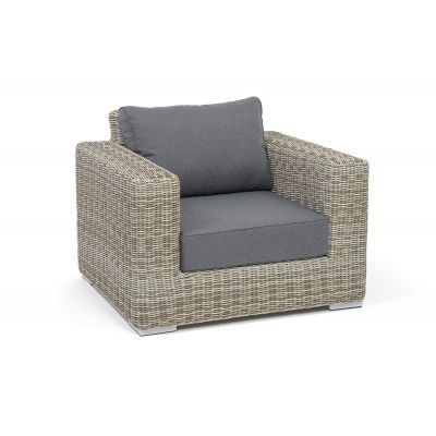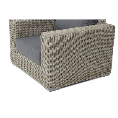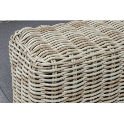 Кресло оснащено каркасом из прочного алюминия, ручное круглое плетение является основным декоративным элементом мебели. Оно выполнено из искусственного ротанга в бежевом цвете.