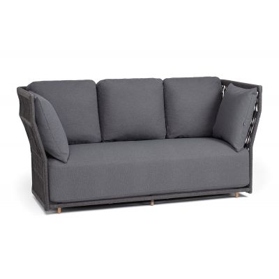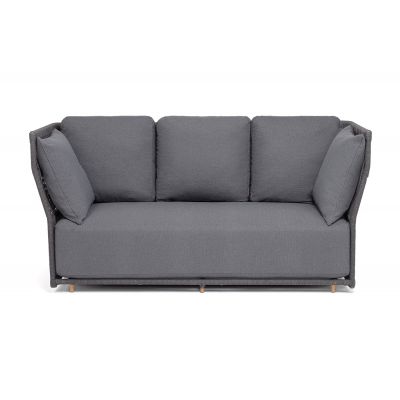 Диван имеет алюминиевый каркас, окрашенный порошковой краской в темно-серый цвет. Боковины каркаса и спинка вручную оплетены роупом - эластичными синтетическими лентами, изготовленными из высокопрочных полиэфирных волокон. Цвет оплетки в тон каркасу - темно-серый.