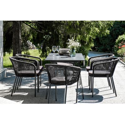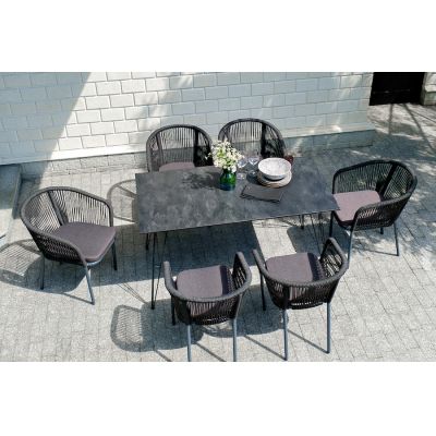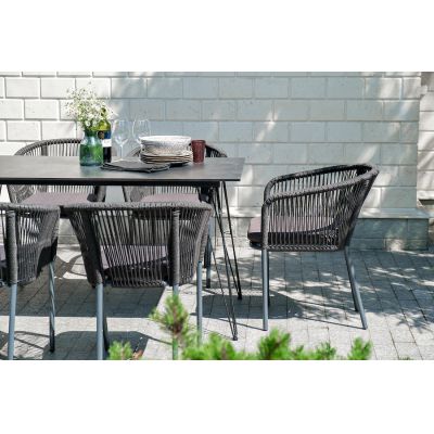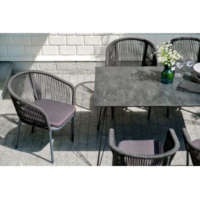 Каркас стульев - алюминиевый, оплетен вручную современным материалом - роупом. Это эластичные синтетические ленты из высокопрочных полиэфирных волокон. В комплект входят подушки со съёмными водоотталкивающими чехлами серого цвета.