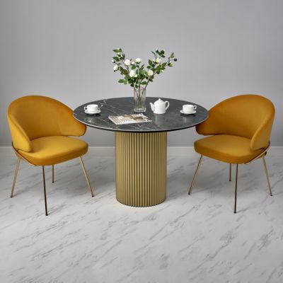 | Элегантная круглая опора: | металлическая основа золотого цвета придает столу стабильность и стильный современный вид, идеально гармонируя с мраморной столешницей. |