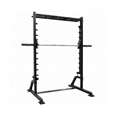 Модель рассчитана на максимальный вес пользователя до 120 кг. Тренажёр оснащён грифом для приседаний, который перемещается по направляющим и фиксируется с помощью ограничительных кронштейнов безопасности, расположенных сверху вниз по всей высоте конструкции. Для надёжной фиксации весовых блинов предусмотрен пружинный зажим.