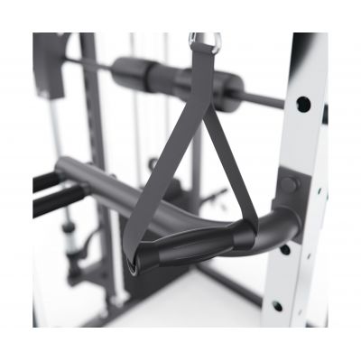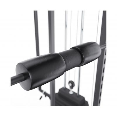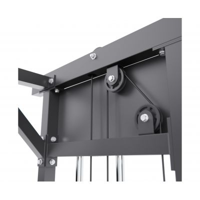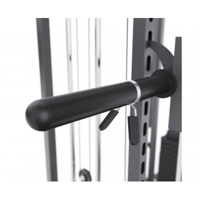 Тренажёр оснащён верхними и нижними блоками, а также набором рукоятей: прямая, V-образная, манжета для ног и дополнительные адаптеры. Система тросов использует тросы длиной 60 см и диаметром 5 мм, оснащённые пружинами и фиксаторами, что обеспечивает плавный ход, точную регулировку нагрузки и долговечность в условиях интенсивной эксплуатации. На стойках расположены держатели для весовых пластин, а встроенный гриф имеет длину 80 см и толщину 5 мм, что обеспечивает удобную загрузку дисков и стабильную работу при выполнении упражнений.