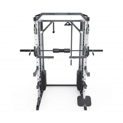 Тренажёр оснащён двумя блоками кроссовера, каждый из которых имеет вес 72 кг, что позволяет точно регулировать нагрузку и эффективно прорабатывать различные группы мышц. Отдельно предусмотрены амортизатор и весовой диск, упор для ног и поручни, что позволяет выполнять тяги, жимы, приседания, проработку спины, рук и корпуса. Турник с широкой перекладиной даёт возможность выполнять множество упражнений на верхнюю часть тела.