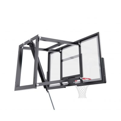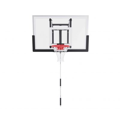 Щит изготовлен из прочного поликарбоната толщиной 2 мм — материала, обеспечивающего хороший отскок мяча и устойчивость к ударам. Его размеры — 110 x 70 см, что делает его максимально приближенным к профессиональному оборудованию. Регулируемый вынос щита (51–55,5 см) повышает безопасность и удобство во время игры. Дополнительную безопасность обеспечивает защита Poly Pade, установленная по нижнему краю щита.