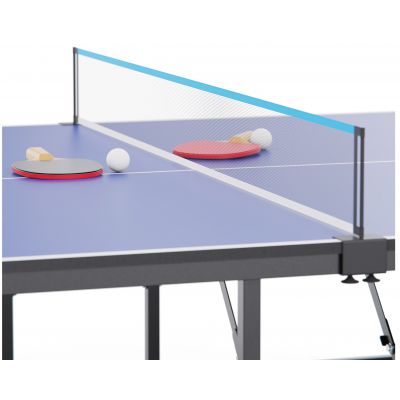 Просторные габариты столешницы обеспечивают комфортное игровое пространство, а надёжная конструкция с компенсаторами неровности пола гарантирует стабильность. В комплект входят все необходимые аксессуары для игры: сетка, ракетки и мячик.