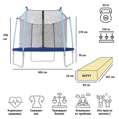 | Оптимально подходит как: | для дачи, для взрослых, до 150 кг, с защитной сеткой, с лестницей, уличные, 10 футов (305 см) |