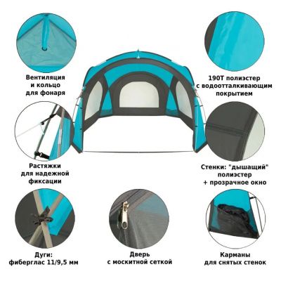 Комментарий: хорошо защищает от сильного ветра, солнца и дождя. Установка сложностей не вызывала ни в первый раз, ни в последующие. Вмещает заявленное количество людей свободно.