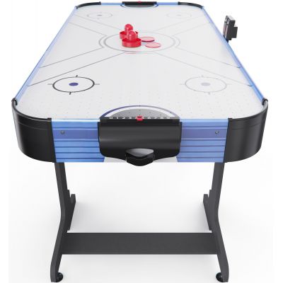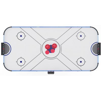 Встроенный вентилятор на 220В создает воздушную подушку, по которой шайба скользит практически без трения — именно так достигается эффект настоящего аэрохоккея. Для удобства игроков стол оснащён электронным и механическим счётчиком очков, что позволяет отслеживать результаты в реальном времени.