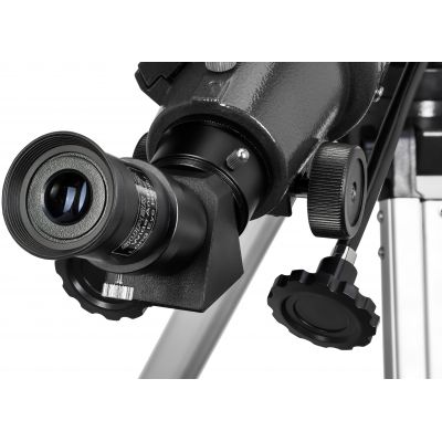 | Диаметр объектива-ахромата составляет 90 мм, а все оптические элементы выполнены из стекла высокого качества с полным многослойным просветлением, поэтому телескоп передает яркое, контрастное и четкое изображение с минимумом искажений. При благоприятном состоянии атмосферы через телескоп можно увидеть очень тусклые объекты. В комплект уже включены окуляры 10 и 25 мм: | первый дает на телескопе увеличение 90х и хорошо подходит для детального изучения планет, второй – это обзорный окуляр (увеличение 36х). Для удобства поиска объектов используется оптический искатель 6х30, а оборачивающая призма обеспечивает правильное прямое изображение, необходимое при изучении наземных ландшафтов. |