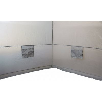 Форма тента полностью повторяет форму палатки и дублирует все необходимые элементы: вытяжной клапан над дверью палатки, окошко, внутреннюю юбку и двухстворчатую дверь. Для удобства пользователей под потолком и на стенах предусмотрено множество петелек для подвешивания различных предметов. На стенках имеются кармашки для вещей и удильников. Тент изготовлен из светлого материала, который обеспечивает высокую световую проводимость, поэтому в палатке будет светло даже в пасмурную погоду.