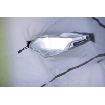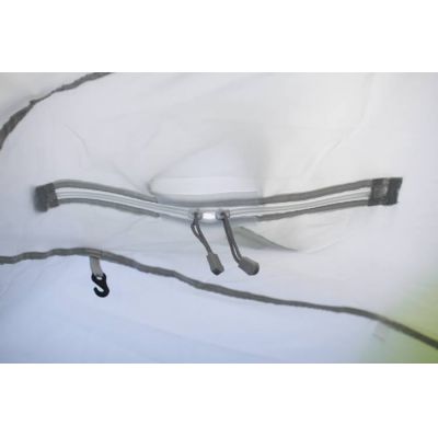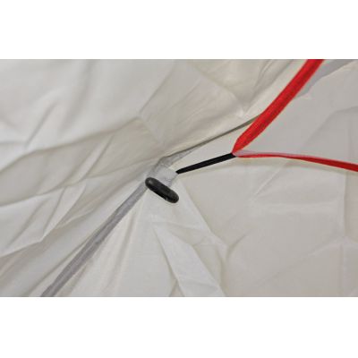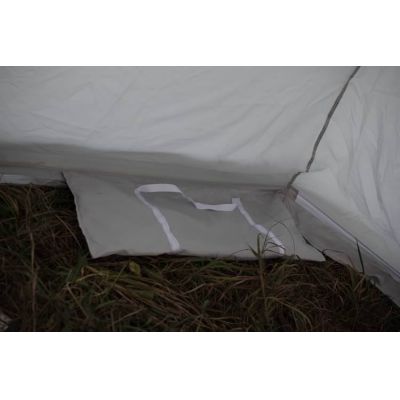 Форма тента полностью повторяет форму палатки и дублирует все необходимые элементы - вытяжные клапаны, внутреннюю юбку и дверь и окошко. Тент легко крепится к каркасу изнутри на уже установленную палатку. Между внутренним и внешним тентом образуется воздушное пространство около 5 см и служит хорошим теплоизолятором.