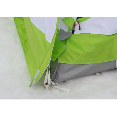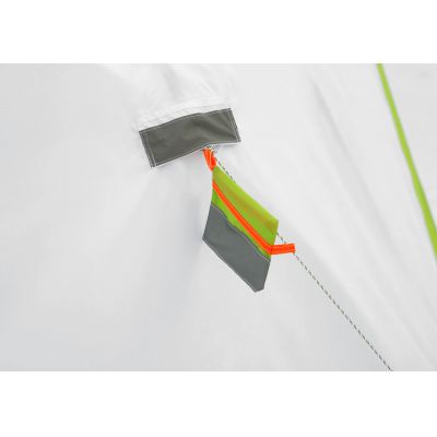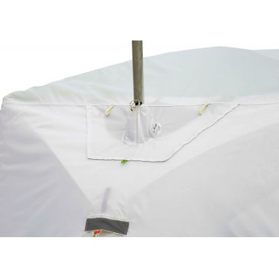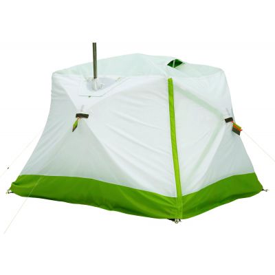 Тент легко и быстро устанавливается силами одного человека на заранее раскрытую палатку. Тент оснащен системой крепления к куполу палатки и грунту, обеспечивая палаточному укрытию надежную защиту от дождя, при сохранении высокой ветроустойчивости конструкции в целом.