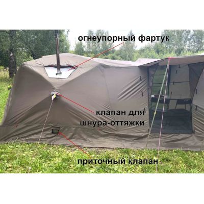 Влагозащитный тент-тамбур Лотос Куб 4 устанавливается поверх купола палатки и формирует тамбур – дополнительное помещение перед ее входом. Тент защищает укрытие от осадков, ветра, солнца и москитов, а также повышает теплоизоляцию внутреннего пространства самой палатки за счет дополнительного слоя ткани.