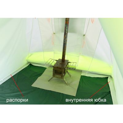 Дверная арка крепится на макушке к спицам каркаса палатки двумя ремнями-резинками, оснащенными жесткими удлинителями с крючками на их концах.По всему нижнему периметру капсулы встроена внутренняя юбка, обеспечивающая плотную стыковку ее стенок с полом палатки. На стенках капсулы изнутри и снаружи вшиты четыре кармашка для мелких предметов.