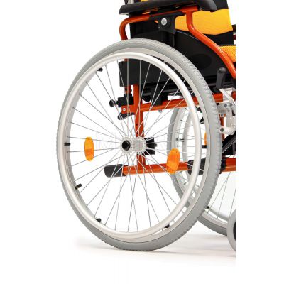 Коляска оснащена пневматическими колесами, обеспечивающими плавный ход и амортизацию на неровных поверхностях. Во время остановки коляска надежно фиксируется боковыми стояночными тормозами.