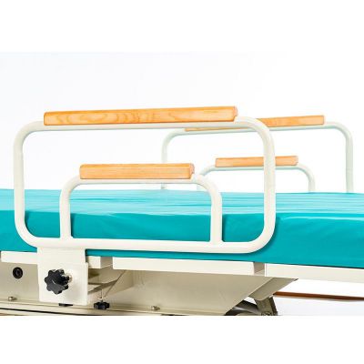 Большим плюсом и главной особенностью данной кровати является возможность выхода пациента вбок. В положении кресла ложе поворачивается перпендикулярно основанию, далее можно регулировать кресло таким образом, чтобы оно, поднимая спинную секцию и опуская икроножную секцию, помогало пациенту встать с кровати.