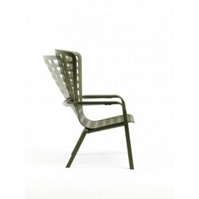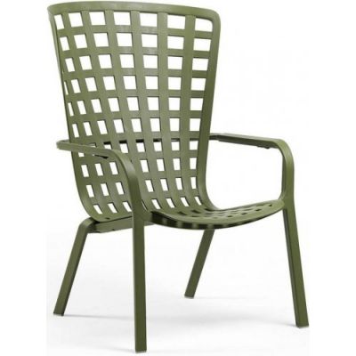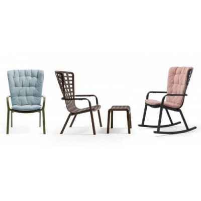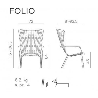 Folio - это инновационное расслабляющее кресло, регулируемое в двух положениях, предназначенное для уличного использования. Изготовлено из перерабатываемой стекловолоконной смолы. Кресло Folio может быть выполнено с фиксированным основанием либо на ножках-полозьях как романтическое кресло-качалка. Основная конструкция кресла сделана из одного перфорированного стекловолоконного листа (отсюда и название на итальянском языке "folio"), украшенного квадратным узором. Особенностью кресла является его изогнутый дизайн, не требующий каких-либо связующих элементов между сидением и спинкой.