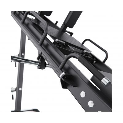 Конструкция тренажера рассчитана на максимальную нагрузку до 250 кг, что позволяет использовать его как новичкам, так и опытным спортсменам. Тренажер оснащён 4 посадочными местами с диаметром посадочного отверстия 50 мм, что совместимо с большинством стандартных весовых дисков.