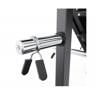 Максимальная нагрузка на узел подвешивания весовых дисков составляет 150 кг, а для хранения дисков — 75 кг. Для удобства и безопасности во время занятий установлен пружинный зажим, который надежно фиксирует диски на грифе, предотвращая их смещение. Такая конструкция обеспечивает стабильность и безопасность при тренировках с большими весами.