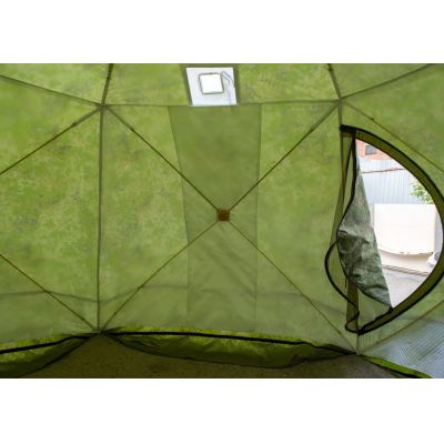 | Вместительность. Шестигранная конструкция с диагональю 4,2 м и высотой 2,2 м рассчитана на 6 и более человек. Пространства хватит для размещения людей, снаряжения и печки. | |