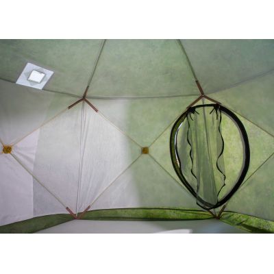 | Вместительность. Шестигранная конструкция с диагональю 3,8 м и высотой 2 м рассчитана на 4 и более человек. Пространства хватит для размещения людей, снаряжения и печки. | |