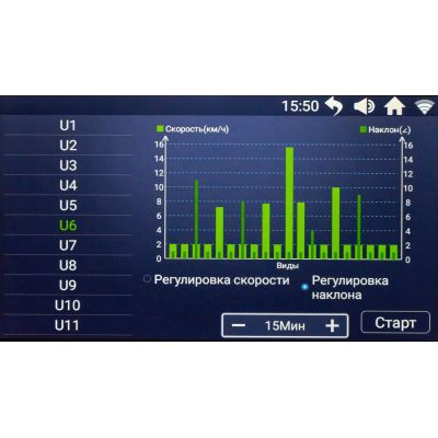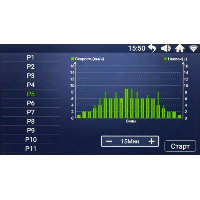 | Показания консоли: | программный профиль, время, дистанция, скорость, угол наклона, калории, пульс |