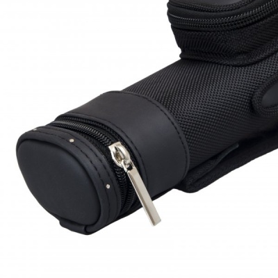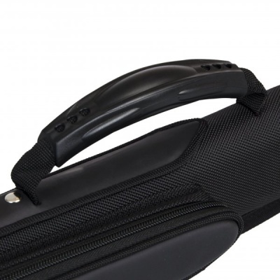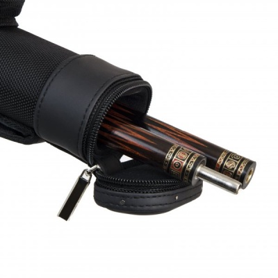 Есть ручка сбоку и наплечный ремень с регулировкой длины. На ремне есть специальная вставка для комфортной носки на плече. Каждая часть кия хранится в отдельном отсеке. С внешней стороны имеются карманы для аксессуаров и удлинителя. Большой карман внутри снабжен дополнительной молнией для надежной фиксации.