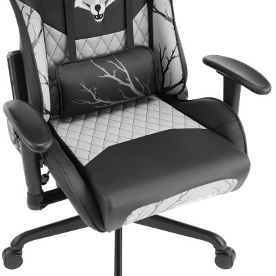 Это не просто кресло – это портал в мир культовой игры, созданный при непосредственном участии разработчиков Tiny Bunny! Каждый элемент дизайна продуман до мелочей и пропитан мрачной атмосферой леса: вышитая мордочка волка на спинке смотрит прямо в душу, напоминая о таинственных существах из игры. Детализированные лапы с острыми когтями по бокам создают ощущение, что кто-то незримо присутствует рядом. По всей поверхности экокожи раскинулись серые и черные ветви деревьев без листьев – словно зимний лес из игры обволакивает тебя своей загадочной аурой. От фирменных ушек на подголовнике до пушистого хвостика в комплекте: каждый элемент работает на создание неповторимой атмосферы.
